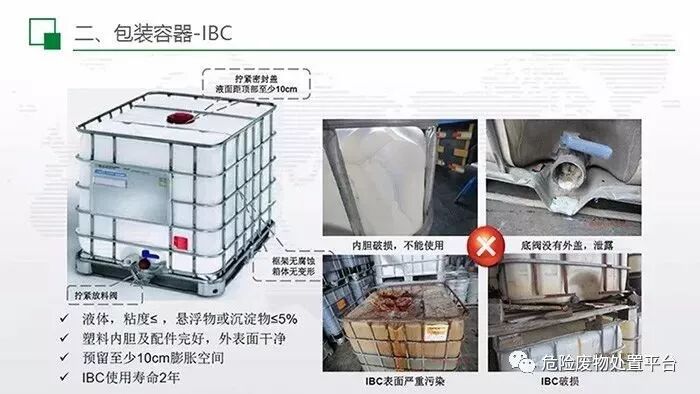 IBC桶对于液体基本都能满足需求,且重复使用率高,存取快捷,特别适用产出量较大的规模性企业。但对于固废、粘稠液体及含有杂质的较多的液体都不适用。并且存在寿命、完整度、存储规范等要求。