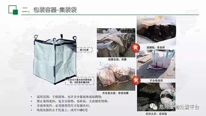 集装袋(吨袋)主要用于固体类废物的包装(例如污泥),但不能用于尖锐、易碎、大块、含液率高的固废。