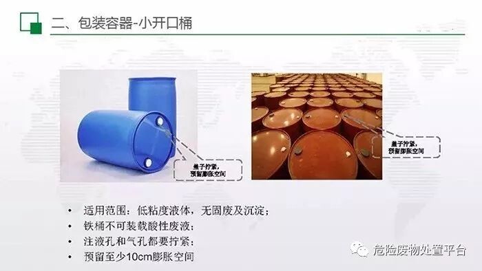 小开口桶主要用于低粘度液体,并且不存在固废和沉淀;铁桶不可装载酸性废液,在留足10cm膨胀空间后,将注液孔与气孔同时拧紧。
