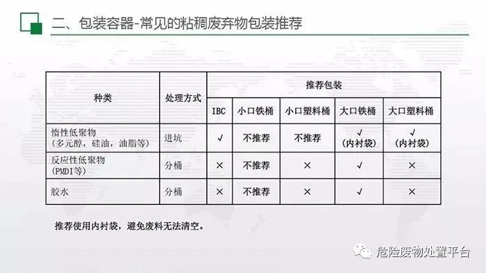 常见粘稠类废弃物(例如胶水、硅油等),因其较难与容器分离,需采用大口径包装容器,必要时需要放置内衬袋。同时,塑料类包装容器多数情况下无法使用。