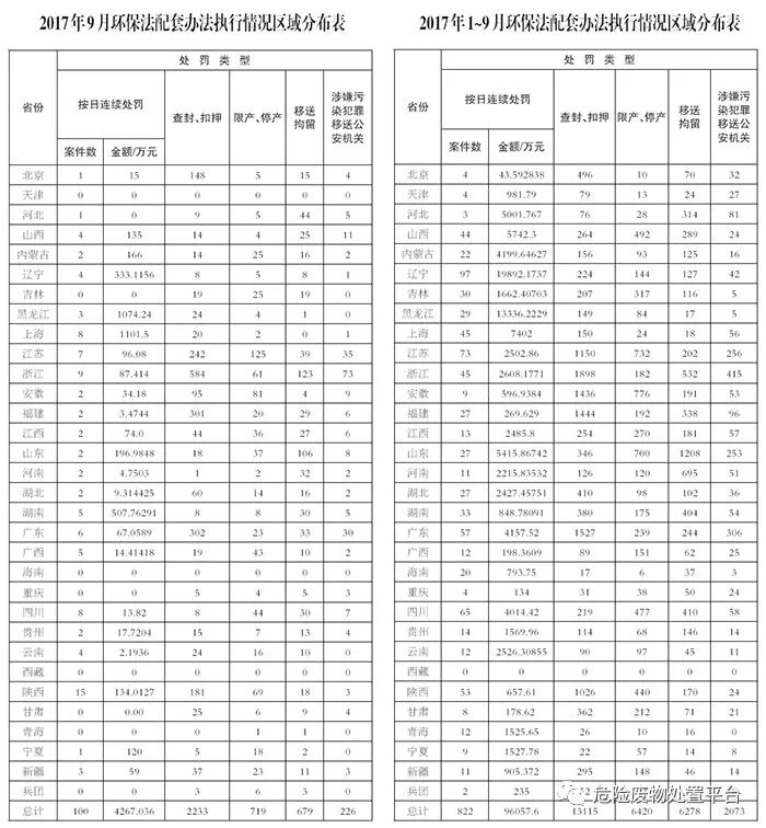环境保护部今日向媒体通报各地环保部门2017年9月执行《环境保护法》配套办法及移送环境犯罪案件的情况。对1~9月份案件较多的浙江、山东、安徽、江苏、广东、福建等地进行表扬。对零案件县(区)较多的河南、云南两省及信阳、郑州、西宁、张家口等4市通报批评。