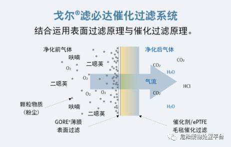 戈尔公司于1998年首创了独特的控制二噁英工艺——戈尔滤必达催化滤袋,它由膨体聚四氟乙烯(ePTFE)构成的戈尔薄膜与催化基料覆合而成,通过催化过滤和表面过滤相结合来解决垃圾焚烧中的二噁英控制。戈尔薄膜能够将微细颗粒拦截在过滤器表面,清灰时粉尘会从滤袋表面掉落并被收集到袋式除尘器的灰斗中,气态二噁英类物质穿过戈尔薄膜进入催化毛毡,在催化剂作用下二噁英即刻发生氧化分解反应,被分解为极微量的CO2、H2O与HCI。