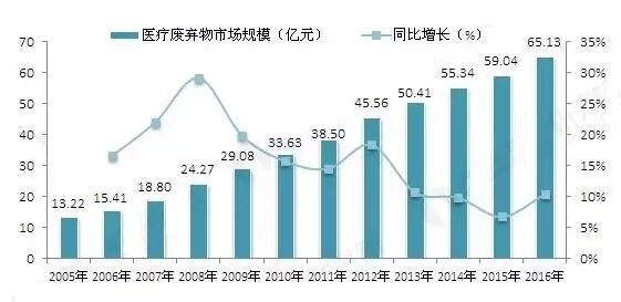 不过,医疗废弃物处理方式存在问题以及产生量的增加,表明医疗废弃物处理行业存在很大机遇。据此估算,2016年,我国医疗废弃物处理市场规模达65.13亿元,且仍保持较快发展态势。随着医疗服务提升,医疗废物处理行业还有很大提升空间,前景可期。