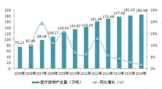 更令人担忧的是,医疗废弃物的产生量在大幅提升,进一步加剧处理医疗废弃物的压力。数据显示,我国医疗废弃物产生量已从2005年的75.12万吨增至2016年的185.49万吨。