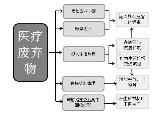 我国对医疗废物的处置长期重视不够,集中处置设施建设严重滞后,大部分危险废物处于低水平综合利用、简单贮存或直接排放状态。具体来说,目前处理的方式主要有五种,即将医废卖给小贩、随意丢弃医废、将医废混入生活垃圾、直接焚烧填埋医废、集中回收处理医废。