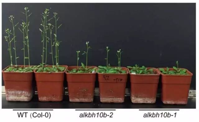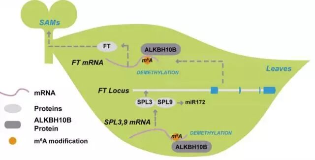 北京大学化学学院何川/贾桂芳课题组充分利用其在m6A去甲基酶领域的研究经验,对这一悬而未决的问题进行了开创性的探索。通过序列比对,该课题组找到了拟南芥中N6-甲基腺嘌呤修饰潜在的去甲基酶,并着重研究了ALKBH10B的去甲基功能及其在拟南芥生命活动中的调控作用。首先,体外表达纯化的ALKBH10B蛋白对单链短RNA和全长的拟南芥mRNA都有明显的m6A去甲基活性。通过比较野生型Col-0,ALKBH10B的T-DNA插入突变体,突变体回补和无活性回补株系,以及ALKBH10B过表达株系mRNA中m6A的含量,表明ALKBH10B的去甲基功能影响了拟南芥mRNA的m6A水平。ALKBH10B缺失导致显著的晚花表型,且与去甲基酶活性相关。在ALKBH10B的T-DNA插入突变体中,FT基因mRNA的甲基化水平升高,而相应地,其mRNA稳定性也较野生型Col-0更低,最终导致FT的mRNA水平在突变体中显著低于野生型。同样,FT上游的SPL3和SPL9也在突变体中有更高的mRNA甲基化水平,更快的mRNA降解和更低的mRNA水平。由此确证ALKBH10B通过影响FT,SPL3和SPL9影响拟南芥的成花诱导。