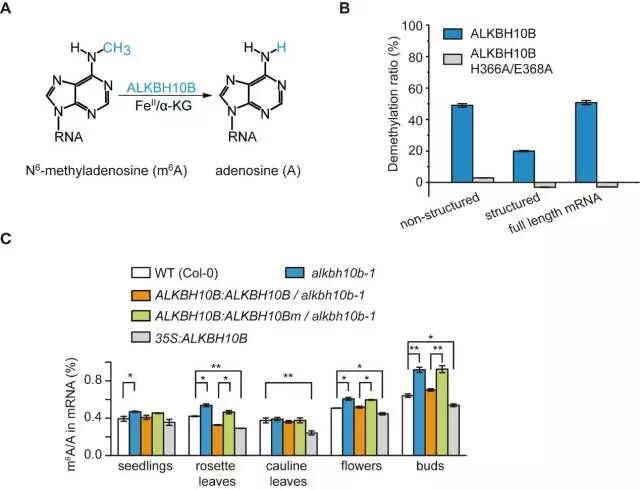 A. 拟南芥m6A去甲基酶ALKBH10B; B. LKBH10B体外去甲基酶活验证;C. ALKBH10B体内去甲基酶活验证;