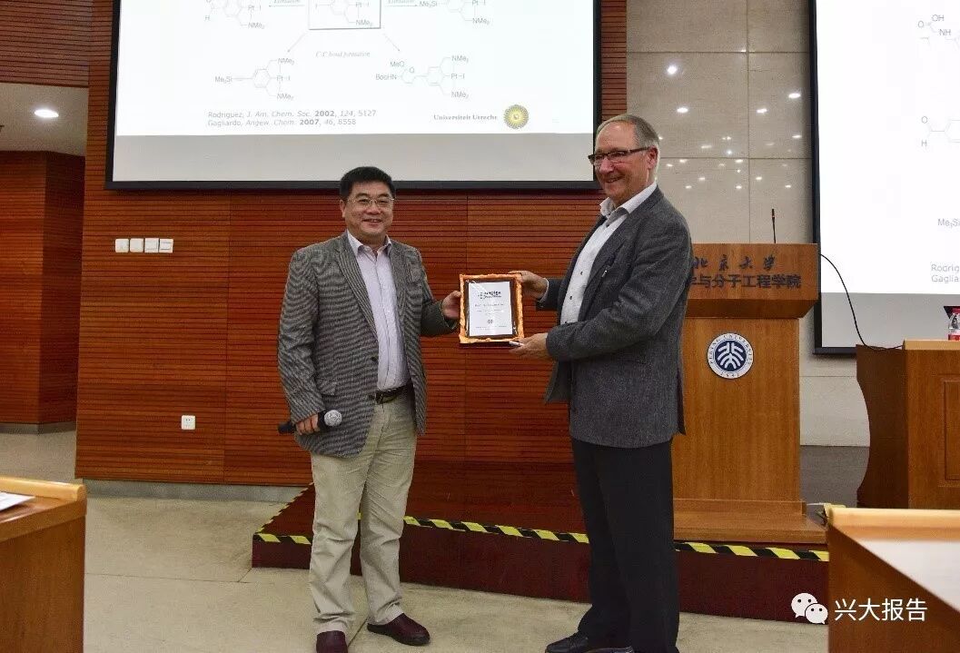 van Koten教授在演讲过程中多次强调了基础研究与应用研究的各自特点和相互关系,鼓励研究者更加重视基础研究中的基本科学问题,强调了研究特色和系统性。报告结束后,van Koten教授和与会者进行了热烈的讨论。此次报告受到老师和同学们的高度好评。吴凯教授向van Koten教授赠送了“兴大报告”奖章,并合影留念。