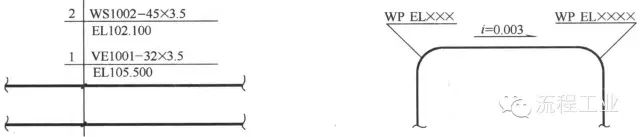 管路安装有坡度要求时,应注坡度(代号i)和坡向,如下图所示,图中“WPEL×××.×××”为工作点标高。