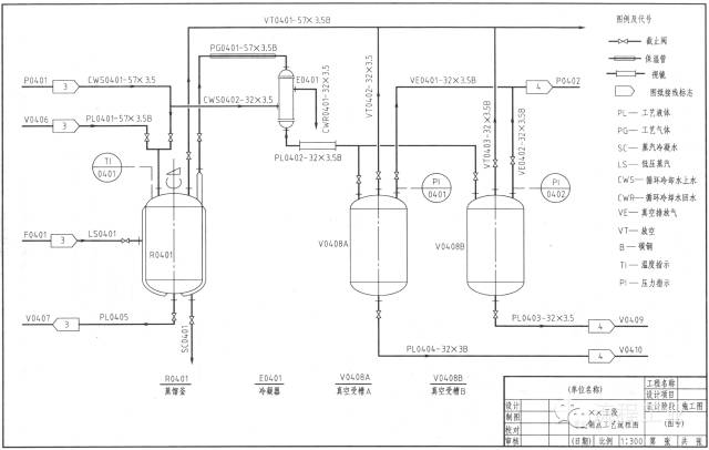 看标题栏和图例中的说明,了解图样名称、各种图形符号、代号的意义及管道的标注等。掌握系统中设备的数量、名称及位号,了解物料的工艺施工流程线。