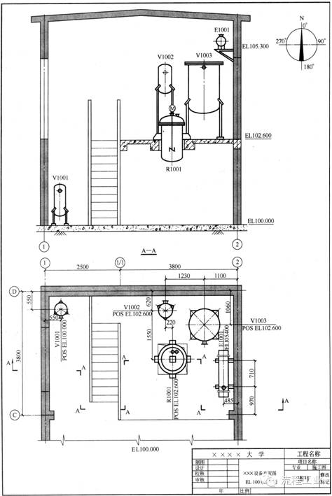 (2)尺寸 图中要标注与设备定位有关的建筑物定位轴线的编号、设备支承点(POS)标高和设备管口的标高、设备的名称与位号等。图中尺寸的单位除标高及总平面图以米为单位外,其他尺寸均以毫米为单位。地面设计标高为EL100.00。